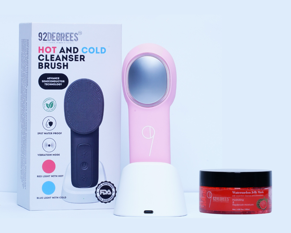 92 Degrees Heat and Cold Electric Facial Cleansing Brush, Gentle Face Scrubber IPX7 Waterproof, Rechargeable Silicone Exfoliator with Vibration Massage, Red/Blue Light Features for Skin Care Support